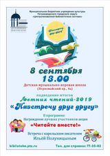 8 сентября 2019 года в Детской музыкально-хоровой школе муниципальные библиотеки Петрозаводска подвели итоги Летних чтений «Навстречу друг другу» и акции «Читайте вместе!». В ходе мероприятия состоялось награждение лучших читателей летних чтений «Навстречу друг другу», которые в течение трех месяцев знакомились с детской зарубежной литературой.