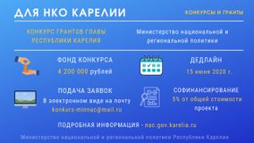 Министерство национальной и региональной политики Республики Карелия (далее - Министерство) в соответствии с Порядком определения объема и предоставления из бюджета Республики Карелия грантов в форме субсидий социально ориентированным некоммерческим организациям (за исключением государственных (муниципальных) учреждений), достигшим наилучших результатов, на реализацию мероприятий по укреплению единства российской нации и этнокультурному развитию народов России, утверждённым постановлением Правительства Республики от 21 апреля 2020 года № 155-П, приказом Министерства от 18 мая 2020 года № 110 «О конкурсном отборе социально ориентированных некоммерческих организаций (за исключением государственных (муниципальных) учреждений), достигших наилучших результатов, для предоставления из бюджета Республики Карелия грантов в форме субсидий на реализацию мероприятий по укреплению единства российской нации и этнокультурному развитию народов России», проводит конкурсный отбор на предоставление грантов Главы Республики Карелия по направлениям поддержки: