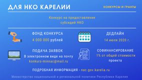 Подробнее о правилах участия и требованиям к заявителю – на сайте Министерства по ссылке: http://nac.gov.karelia.ru/news/23-06-2020-obyavlen-konkursnyy-otbor-na-predostavlenie-subsidiy-iz-byudzheta-respubliki-kareliya-nekommercheski/