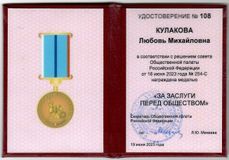 В торжественной обстановке медаль была вручена Любови Кулаковой членом Общественной палаты Российской Федерации от Запорожской области, председателем Комиссии по вопросам суверенитета, патриотическим проектам и поддержке ветеранов, политиком, экономистом, Роговым Владимиром Валериевичем.