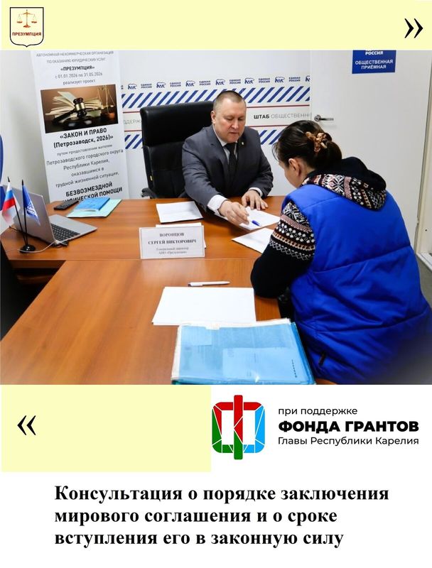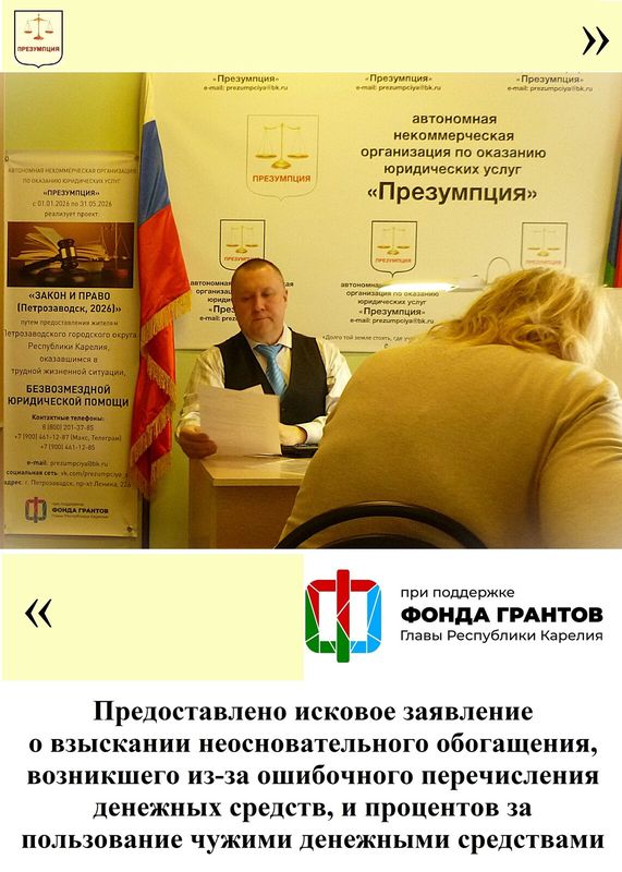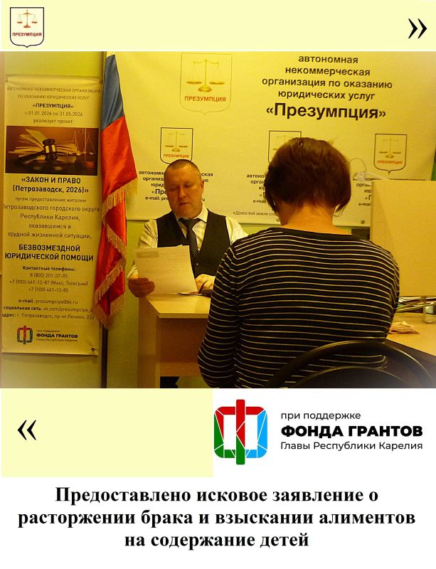 С 1 января по 31 мая 2026 года АНО «Презумпция» в ходе реализации проекта «Закон и право (Петрозаводск, 2026)» предоставляет юридическую помощь гражданам в трудной жизненной ситуации, включая женщин и семей участников Специальной военной операции, проживающих на территории Петрозаводского городского округа Республики Карелия, и нуждающихся в бесплатной юридической помощи.