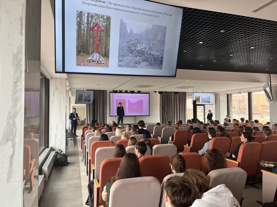 Классный час провели Даниил Чепурной и Анна Сандберг. В ходе живого диалога участники обратились к героическим страницам обороны Петрозаводска в сентябре 1941 года. Организаторы стремились не просто освежить в памяти события Великой Отечественной войны, но и осмыслить, как подвиг защитников города формирует нравственные ориентиры современного общества.