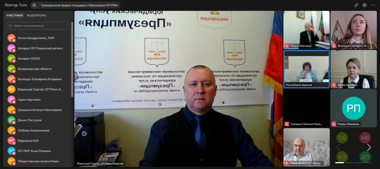 В заседании принял онлайн-участие Сергей Воронцов, Председатель комиссии по вопросам соблюдения законности, правопорядка и взаимодействию с ОНК (генеральный директор автономной некоммерческой организации по оказанию юридических услуг «Презумпция»).